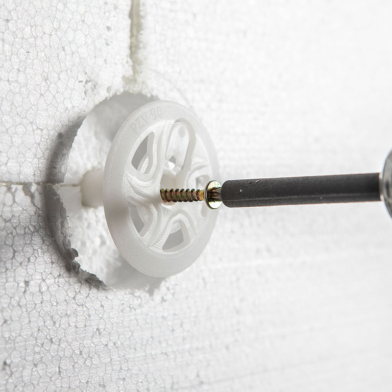 Pritrdilni elementi morajo biti izdelani brez toplotnega mostu. Za sidranje potrebujemo rezkalnik, s katerim izdolbemo luknjo v izolacijsko ploščo in hkrati zavrtamo v podlago. Odstranimo prah iz vrtine z močnim vpihom. Vstavimo sidro in ga pokrijemo z izolacijskim vložkom.